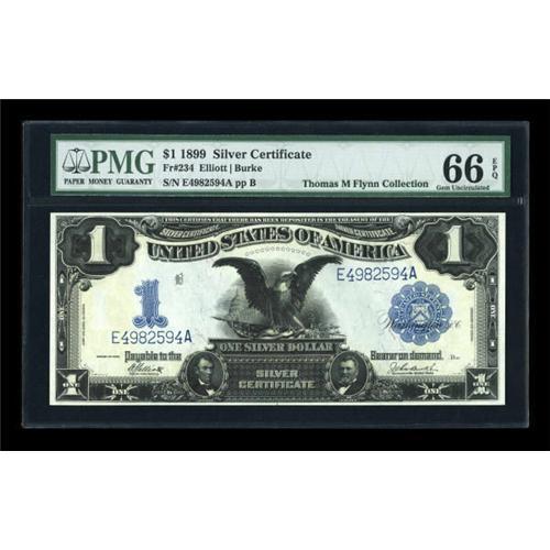 <B>Fr. 234 $1 1899 Silver Certificate PMG Gem Uncirculated 66 EPQ.</B></I> A gorgeous Black Eagle with broad, even margins, easily seen original embossing, perfect colors of the paper and inks and the all-important qualifier, "Exceptional Paper Quality."<BR><I>From The Thomas M. Flynn Collection</B></I><BR><BR><b>Shipping:</b> Coins & Currency (<a target="_blank" href="http://www.heritageauctions.com/common/shipping.php">view shipping information</a>)
