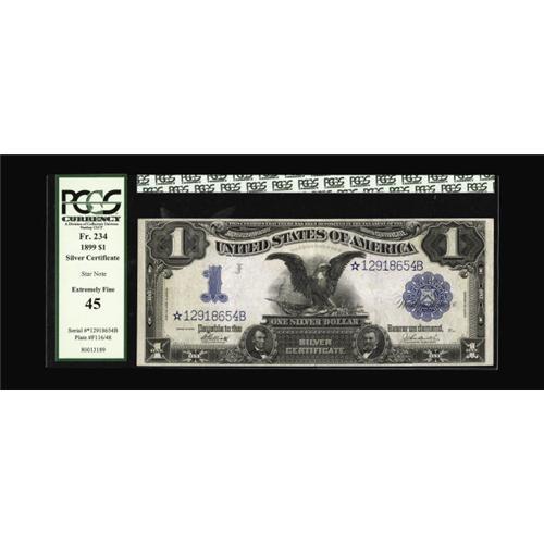 <B>Fr. 234 $1 1899 Mule Silver Certificate Star Note PCGS Extremely Fine 45.</B></I> A wonderful replacement Black Eagle that is a pleasing mid-grade example with plenty of crispness left.