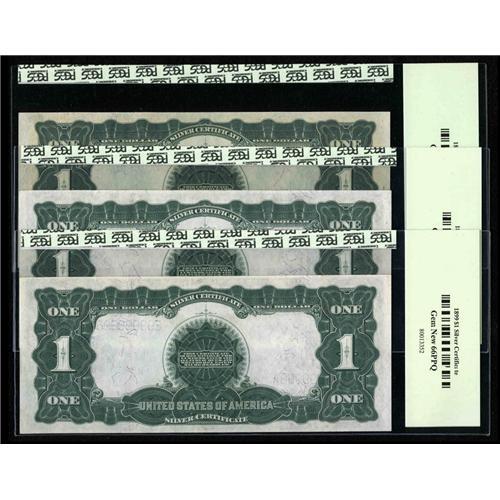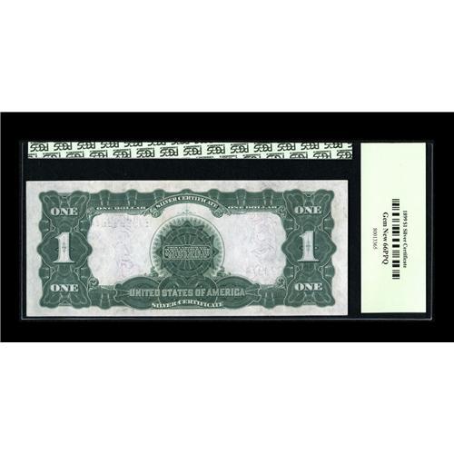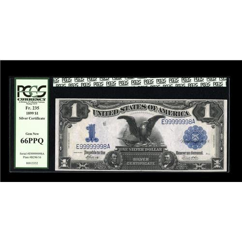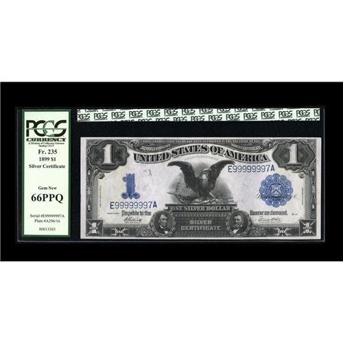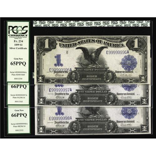 <B>Fr. 234 and 235 $1 1899 Silver Certificates Changeover Trio PCGS Gem New 65-66PPQ.</B></I> The first note in this wonderful group of three is the final Elliot-Burke signed Black Eagle. It's the position "D" note from the final sheet produced for this signature combination, serial number E99999996A. The next sheet contained the Serial Number 100000000 note of the Elliot-White signature combination, which was the first produced sheet for Fr. 235's. We offer in this lot the first two notes from that sheet, serial numbers E99999997A and E99999998A. All three notes have been graded by PCGS. The Fr. 234 is a 65PPQ, and the following two Fr. 235's both grade 66PPQ. The combination of a changeover pair, high grades and special serial numbers should easily propel this ultra-rare trio past the five-figure mark.