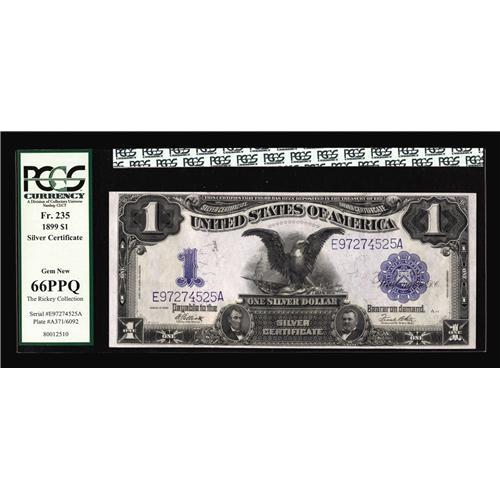 <B>Fr. 235 $1 1899 Mule Silver Certificate PCGS Gem New 66PPQ.</B></I> Hard to imagine Black Eagles finer than this screaming beauty from the Rickey Collection. Back plate number 6092 is in the well hidden mule position at lower right center.