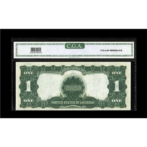 <B>Fr. 235 $1 1899 Silver Certificate CGA Gem Uncirculated 65.</B></I> Serial Number K2A. Only three examples from this cut sheet are reported or have been sold publicly. The piece missing is the serial number three. A serial number one note is known from the K-A block and last sold in 2000. This piece is a most pleasing, original specimen with bright colors and decent margins, save for the tight margin at bottom. Its last appearance came back in our FUN sale where it realized $5405.