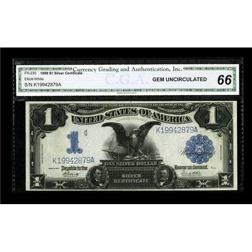 <B>Fr. 235 $1 1899 Silver Certificate CGA Gem Uncirculated 66.</B></I> A very nicely margined example of this extremely popular Black Eagle type.<BR><BR><b>Shipping:</b> Coins & Currency (<a target="_blank" href="http://www.heritageauctions.com/common/shipping.php">view shipping information</a>)