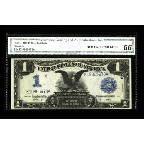 <B>Fr. 235 $1 1899 Silver Certificate CGA Gem Uncirculated 66.</B></I> Plenty of embossing is noticed on this example that is well margined.<BR><BR><b>Shipping:</b> Coins & Currency (<a target="_blank" href="http://www.heritageauctions.com/common/shipping.php">view shipping information</a>)