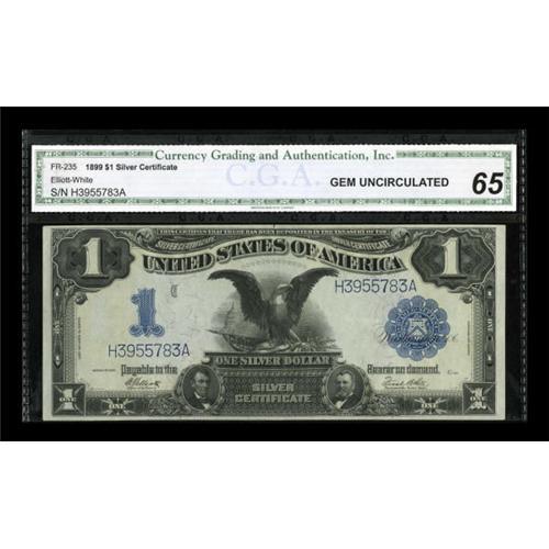 <B>Fr. 235 $1 1899 Silver Certificate CGA Gem Uncirculated 65.</B></I> The second-to-last signature combination of the Black Eagle series.<BR><BR><b>Shipping:</b> Coins & Currency (<a target="_blank" href="http://www.heritageauctions.com/common/shipping.php">view shipping information</a>)