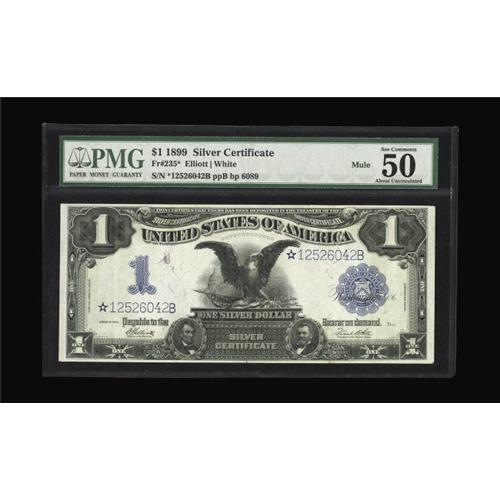 <B>Fr. 235 $1 1899 Silver Certificate Mule Star PMG About Uncirculated 50.</B></I> This is the lowest serial number currently shown in the Gengerke census for this Friedberg number.