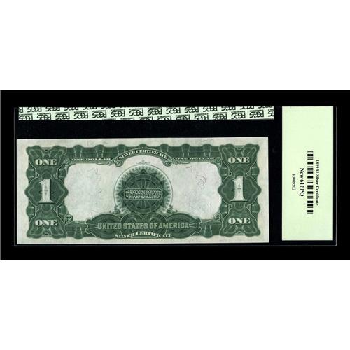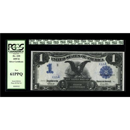 <B>Fr. 235 $1 1899 Silver Certificate PCGS New 61PPQ.</B></I> All the desirable qualities such as embossing, bright color, and firm paper apply on this double digit example that carries serial number K44A. The only distraction is the bottom margin cut into the frame line.<BR><BR><b>Shipping:</b> Coin/Currency (<a target="_blank" href="http://www.heritageauctions.com/common/shipping.php">view shipping information</a>)
