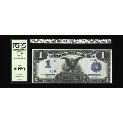 <B>Fr. 235 $1 1899 Silver Certificate PCGS New 61PPQ.</B></I> The surfaces are that of a higher grade example, but the tight bottom cut has sealed the grade on this solid double digit beauty.