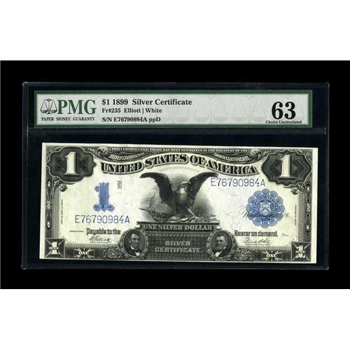 <B>Fr. 235 $1 1899 Silver Certificate PMG Choice Uncirculated 63.</B></I> Solid margins are noticed on this Black Eagle that retains much color. With a touch more bottom margin this certainly would have graded higher.<BR><BR><b>Shipping:</b> Coin/Currency (<a target="_blank" href="http://www.heritageauctions.com/common/shipping.php">view shipping information</a>)