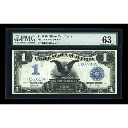 <B>Fr. 235 $1 1899 Silver Certificate PMG Choice Uncirculated 63.</B></I> A pleasing Black Eagle with a matched ending serial number.<BR><BR><b>Shipping:</b> Coins & Currency (<a target="_blank" href="http://www.heritageauctions.com/common/shipping.php">view shipping information</a>)