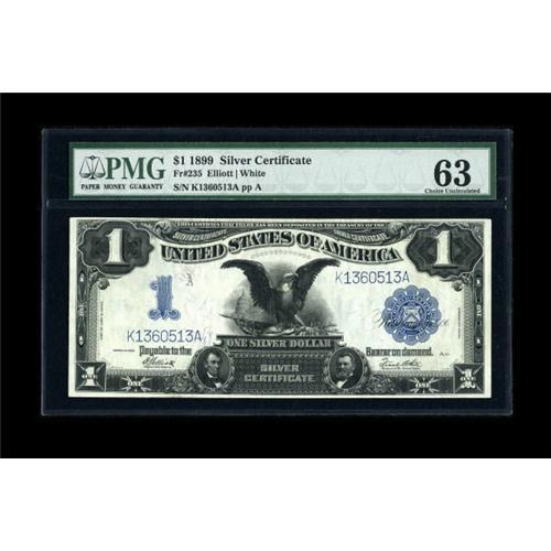 <B>Fr. 235 $1 1899 Silver Certificate PMG Choice Uncirculated 63.</B></I> A pleasing Black Eagle with a matched ending serial number.<BR><BR><b>Shipping:</b> Coins & Currency (<a target="_blank" href="http://www.heritageauctions.com/common/shipping.php">view shipping information</a>)