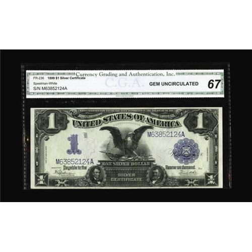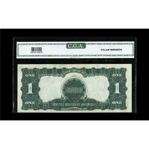 <B>Fr. 236 $1 1899 Silver Certificate CGA Gem Uncirculated 67.</B></I> The consecutive note to this is listed in the census as uncirculated. This piece is very well margined for the issue, bright, and perfectly original.