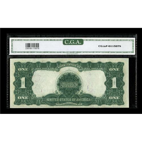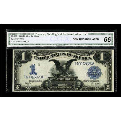 <B>Fr. 236 $1 1899 Silver Certificate CGA Gem Uncirculated 66.</B></I> Beautifully margined with bright color and strong eye appeal. This is the final signature combination of the Black Eagles. A design Type that was our basic dollar bill for nearly 30 years.<BR><BR><b>Shipping:</b> Coins & Currency (<a target="_blank" href="http://www.heritageauctions.com/common/shipping.php">view shipping information</a>)