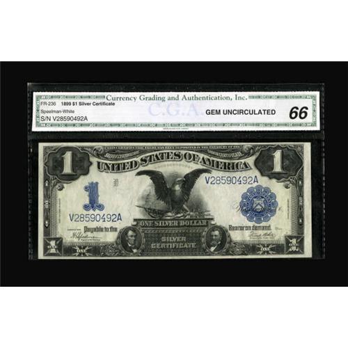 <B>Fr. 236 $1 1899 Silver Certificate CGA Gem Uncirculated 66.</B></I> All the right paper waves are noted in all the right places. The boldly embossed serial numbers and overprint are plainly visible on the back of the note.<BR><BR><b>Shipping:</b> Coins & Currency (<a target="_blank" href="http://www.heritageauctions.com/common/shipping.php">view shipping information</a>)