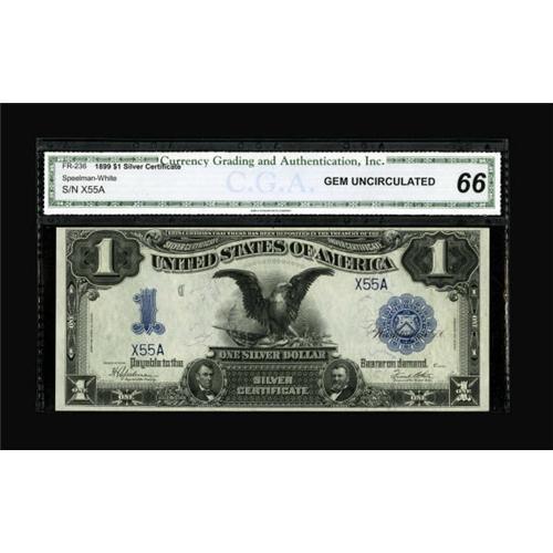 <B>Fr. 236 $1 1899 Silver Certificate CGA Gem Uncirculated 66.</B></I> This wavy piece boasts the two digit serial number X55A.<BR><BR><b>Shipping:</b> Coins & Currency (<a target="_blank" href="http://www.heritageauctions.com/common/shipping.php">view shipping information</a>)