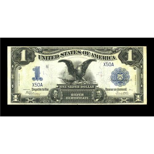 <B>Fr. 236 $1 1899 Silver Certificate Choice New.</B></I> Though lightly toned, this Black Eagle is all original and all new. Fancy serial numbers are popular among aficionados of this type, this note boasts a two digit number, X50A.