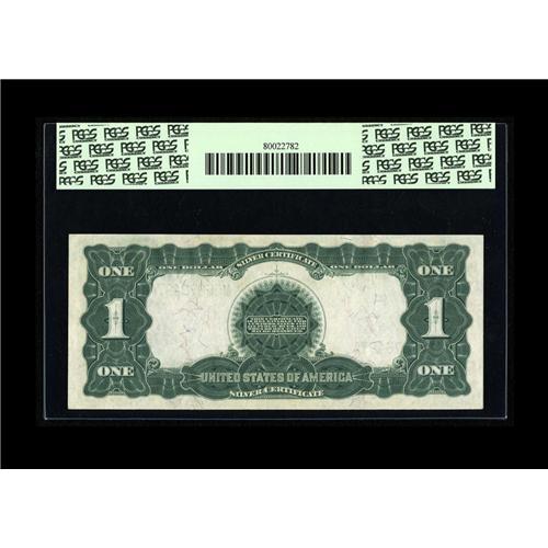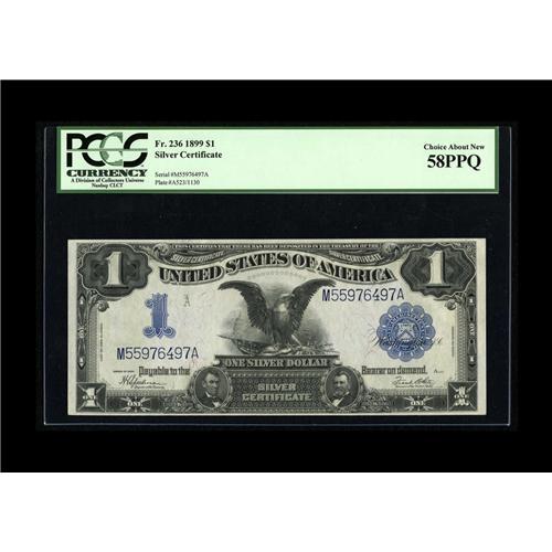 <B>Fr. 236 $1 1899 Silver Certificate PCGS Choice About New 58PPQ.</B></I> An unfortunate corner tip fold that barely touches the design is accountable for the grade. The surfaces are wholly original with all the right paper waves in all the right places.<BR><I>From The Jeffrey L. Olyan Collection, Part 1</B></I>