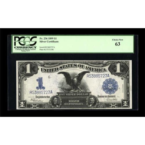 <B>Fr. 236 $1 1899 Silver Certificate PCGS Choice New 63.</B></I> Solid margins frame this deeply printed issue.<BR><BR><b>Shipping:</b> Coins & Currency (<a target="_blank" href="http://www.heritageauctions.com/common/shipping.php">view shipping information</a>)
