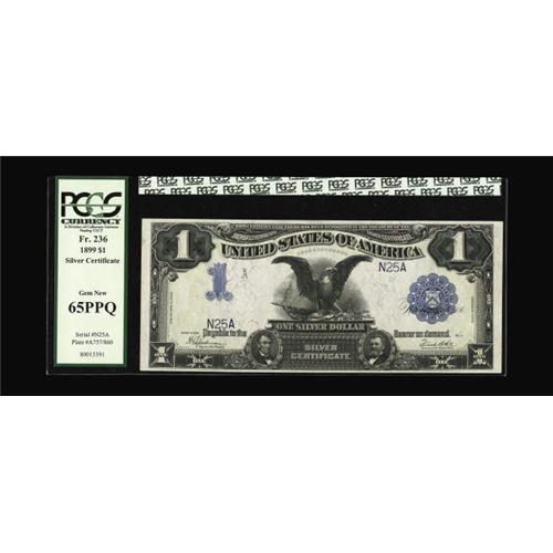 <B>Fr. 236 $1 1899 Silver Certificate PCGS Gem New 65PPQ.</B></I> Serial number N25A graces this broadly margined, well embossed note.