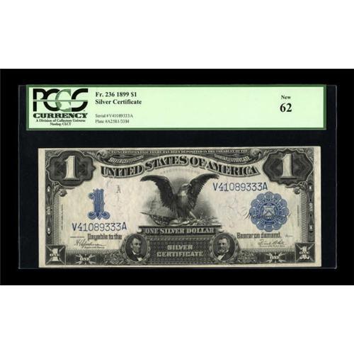 <B>Fr. 236 $1 1899 Silver Certificate PCGS New 62.</B></I> A light fold runs through the broad left margin of this Black Eagle. It is, however, completely clear of the deeply embossed design. The margins are fully sufficient for a Gem.<BR><BR><b>Shipping:</b> Coins & Currency (<a target="_blank" href="http://www.heritageauctions.com/common/shipping.php">view shipping information</a>)