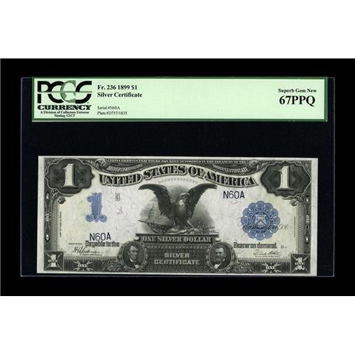 <B>Fr. 236 $1 1899 Silver Certificate PCGS Superb Gem New 67PPQ.</B></I> The round two-digit serial number N60A combines with tremendous technical merit and beautiful eye appeal on this Ace Black Eagle.<BR><BR><b>Shipping:</b> Coin/Currency (<a target="_blank" href="http://www.heritageauctions.com/common/shipping.php">view shipping information</a>)