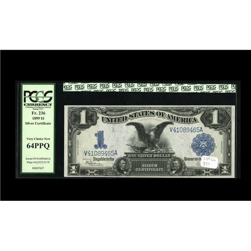 <B>Fr. 236 $1 1899 Silver Certificate PCGS Very Choice New 64PPQ.</B></I> Here is yet another pleasing Black Eagle that has a tight margin at bottom left.