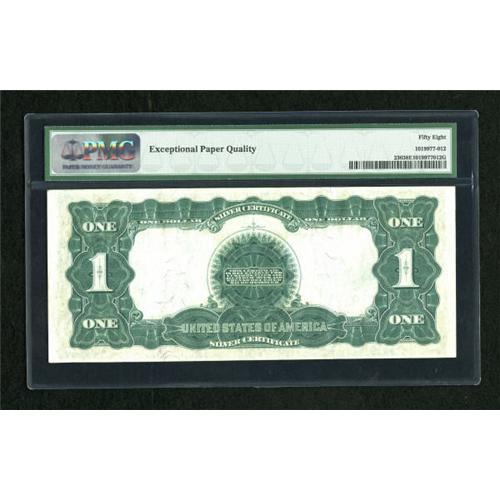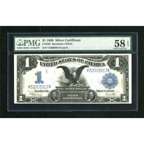 <B>Fr. 236 $1 1899 Silver Certificate PMG Choice About Unc 58 EPQ.</B></I> A small corner tip fold at lower right accounts for the grade. The piece is boldly original with paper waves and deep embossing.<BR><BR><b>Shipping:</b> Coins & Currency (<a target="_blank" href="http://www.heritageauctions.com/common/shipping.php">view shipping information</a>)