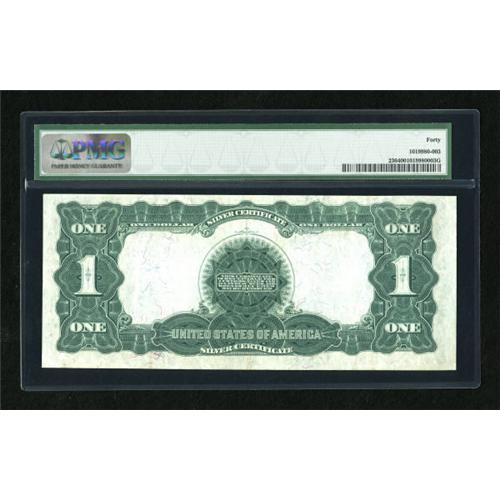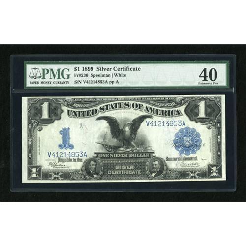 <B>Fr. 236 $1 1899 Silver Certificate PMG Extremely Fine 40.</B></I> A centerfold and some light handling account for the grade on this bright and eye appealing Black Eagle.<BR><BR><b>Shipping:</b> Coins & Currency (<a target="_blank" href="http://www.heritageauctions.com/common/shipping.php">view shipping information</a>)