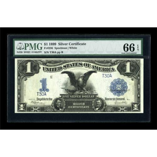 <B>Fr. 236 $1 1899 Silver Certificate PMG Gem Uncirculated 66 EPQ.</B></I> The even two-digit T30A serial number considerably enhances the value of this high grade Black Eagle Ace. <BR><I>From The Drew Keough Collection</B></I><BR><BR><b>Shipping:</b> Coins & Currency (<a target="_blank" href="http://www.heritageauctions.com/common/shipping.php">view shipping information</a>)