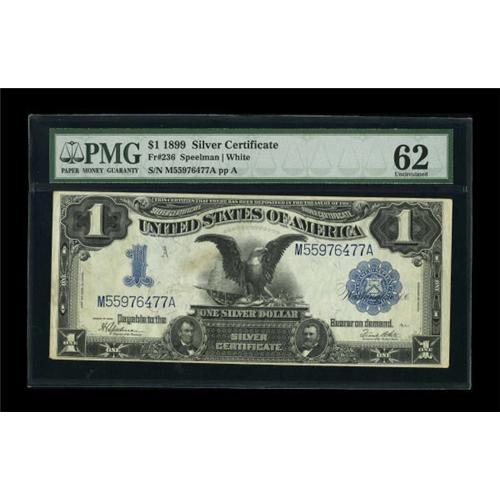 <B>Fr. 236 $1 1899 Silver Certificate PMG Uncirculated 62.</B></I> Embossing and natural paper surfaces are viewed through the third-party holder. The edges do show some handling.<BR><BR><b>Shipping:</b> Coins & Currency (<a target="_blank" href="http://www.heritageauctions.com/common/shipping.php">view shipping information</a>)