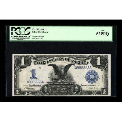 <B>Fr. 236 $1 1899 Silver Certificate Solid Six Serial Number PCGS New 62PPQ.</B></I> Seven consecutive sixes are seen on this original Black Eagle that exhibits a thin margin at lower left.<BR><BR><b>Shipping:</b> Coins & Currency (<a target="_blank" href="http://www.heritageauctions.com/common/shipping.php">view shipping information</a>)