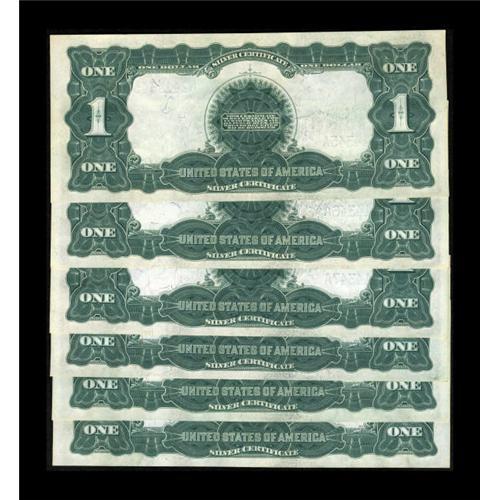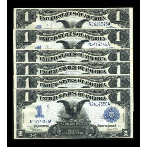<B>Fr. 236 $1 1899 Silver Certificates Choice-Gem Crisp Uncirculated.</B></I> A lovely group of six consecutive Black Eagles that are fresh and original. All have just a trace of handling, and the group ranges from Choice to Gem depending on margins. <BR><BR><b>Shipping:</b> Coins & Currency (<a target="_blank" href="http://www.heritageauctions.com/common/shipping.php">view shipping information</a>)