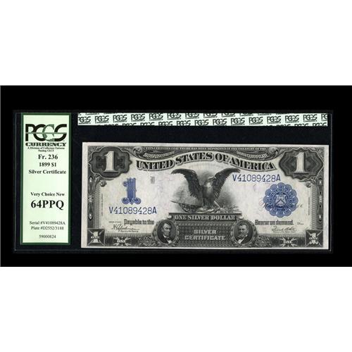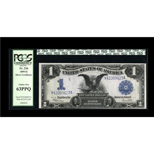 <B>Fr. 236 $1 1899 Silver Certificates. Two Consecutive Examples. PCGS Choice New 63; 64.</B></I><BR>Embossing is prominent on this pair that is separated by one grading point.