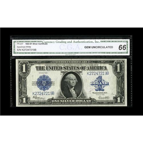 <B>Fr. 237 $1 1923 Silver Certificate CGA Gem Uncirculated 66.</B></I> A nice high end example of the most available of the Large Size types.<BR><BR><b>Shipping:</b> Coin/Currency (<a target="_blank" href="http://www.heritageauctions.com/common/shipping.php">view shipping information</a>)