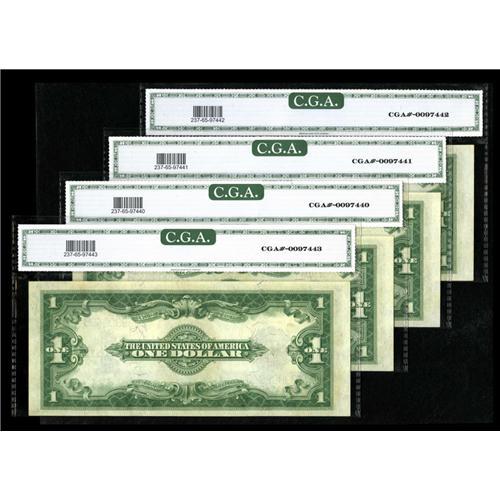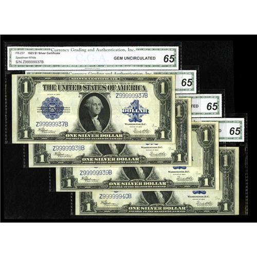 <B>Fr. 237 $1 1923 Silver Certificate CGA Gem Uncirculated 65.</B></I> This fascinating cut sheet features the serial numbers Z99999937B through 40B. Its first appearance at auction was as lot 745 in the Albert A Grinnell Sale in 1945 where it was described, "Sigs. Speelman and White, attractive numbers on this very scarce cut sheet, 99999937 to 99999940, Unc. Crisp." While the block letters were not added to the description, a quick survey of the census indicates these serial numbers are not known for any other blocks and thus must be the notes from the famed Grinnell collection. In that sale, the sheet realized $15, expect it to realize more than that tonight. The notes are bright and crisp though the paper is a bit subdued on the top margin of each piece.<BR><BR><b>Shipping:</b> Coin/Currency (<a target="_blank" href="http://www.heritageauctions.com/common/shipping.php">view shipping information</a>)