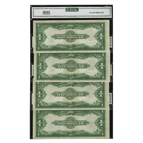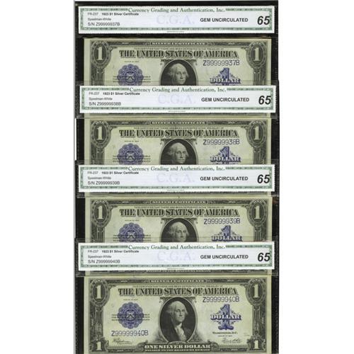 <B>Cut Sheet Fr. 237 $1 1923 Silver Certificates CGA Gem Uncirculated 65.</B></I> This fascinating cut sheet features the serial numbers Z99999937B through 40B. Its first appearance at auction was as lot 745 in the Albert A Grinnell Sale in 1945 where it was described, "Sigs. Speelman and White, attractive numbers on this very scarce cut sheet, 99999937 to 99999940, Unc. Crisp." While the block letters were not added to the description, a quick survey of the census indicates these serial numbers are not known for any other blocks and thus must be the notes from the famed Grinnell collection. In that sale, the sheet realized $15. The notes are bright and crisp though the paper is a bit subdued on the top margin of each piece.<BR><BR><b>Shipping:</b> Coins & Currency (<a target="_blank" href="http://www.heritageauctions.com/common/shipping.php">view shipping information</a>)
