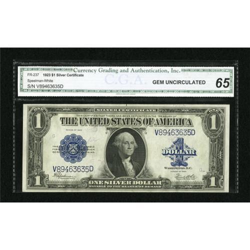 <B>Fr. 237 $1 1923 Silver Certificate CGA Gem Uncirculated 65.</B></I> Plenty of prominent embossing is visible beneath the holder on this bright Blue Seal.<BR><BR><b>Shipping:</b> Coins & Currency (<a target="_blank" href="http://www.heritageauctions.com/common/shipping.php">view shipping information</a>)