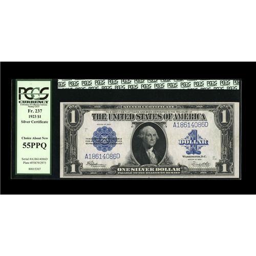 <B>Fr. 237 $1 1923 Silver Certificate PCGS Choice About New 55PPQ.</B></I> Nicely margined and sharply printed.