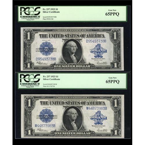 <B>Fr. 237 $1 1923 Silver Certificates PCGS Gem New 65PPQ.</B></I> A pair of 1923 $1 Silvers, each graded <B>Gem New 65PPQ </B></I>by PCGS.<BR><BR><b>Shipping:</b> Coins & Currency (<a target="_blank" href="http://www.heritageauctions.com/common/shipping.php">view shipping information</a>)