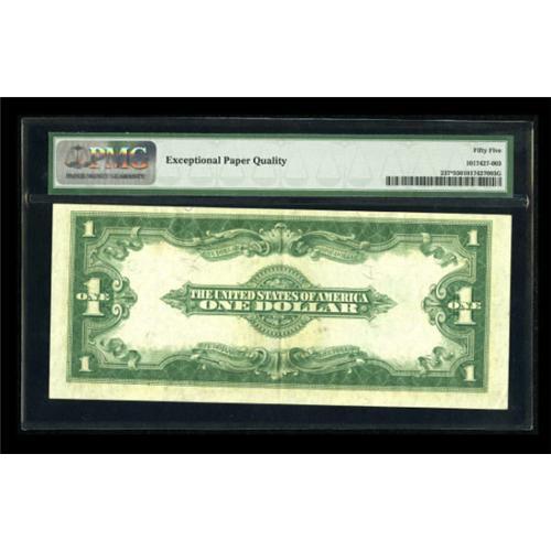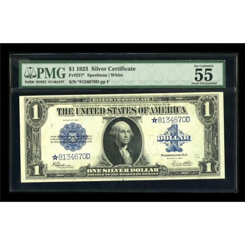 <B>Fr. 237 $1 1923 Silver Certificate Star Note PMG About Uncirculated 55 EPQ.</B></I> A hard center fold is noticed on this bright replacement that retains bright color and is well embossed.<BR><BR><b>Shipping:</b> Coins & Currency (<a target="_blank" href="http://www.heritageauctions.com/common/shipping.php">view shipping information</a>)