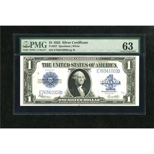 <B>Fr. 237 $1 1923 Silver Certificate PMG Choice Uncirculated 63.</B></I> A top tight margin keeps this bright note from a higher grade.<BR><BR><b>Shipping:</b> Coins & Currency (<a target="_blank" href="http://www.heritageauctions.com/common/shipping.php">view shipping information</a>)