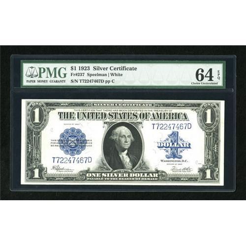 <B>Fr. 237 $1 1923 Silver Certificate PMG Choice Uncirculated 64 EPQ.</B></I> A pleasing piece with decent margins all around.<BR><BR><b>Shipping:</b> Coins & Currency (<a target="_blank" href="http://www.heritageauctions.com/common/shipping.php">view shipping information</a>)