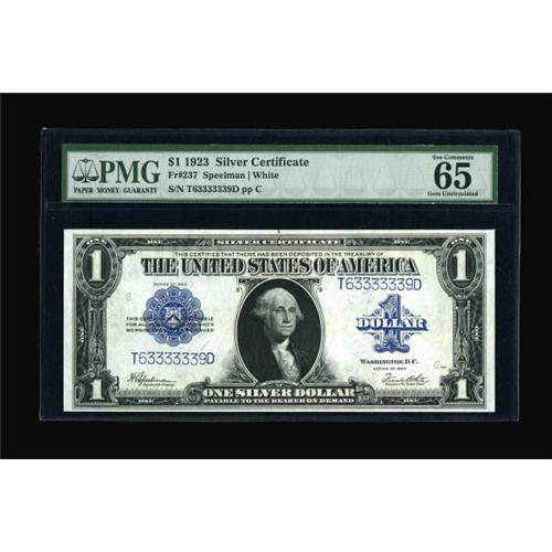 <B>Fr. 237 $1 1923 Silver Certificate PMG Gem Uncirculated 65 EPQ.</B></I> Six threes are seen in the middle of this Fancy Serial Number ace.<BR><BR><b>Shipping:</b> Coins & Currency (<a target="_blank" href="http://www.heritageauctions.com/common/shipping.php">view shipping information</a>)