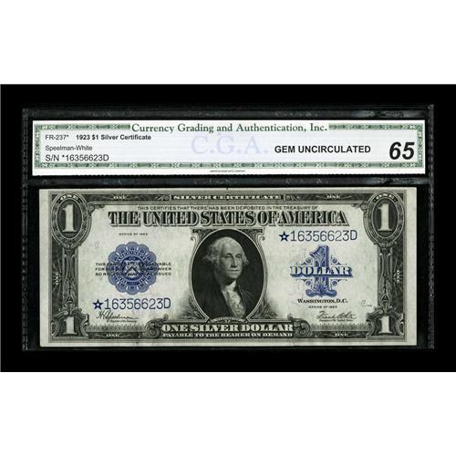 <B>Fr. 237 $1 1923 Silver Certificate Star Note CGA Gem Uncirculated 65.</B></I> This ranks among one of the nicest replacement notes available for this series. Expect to see prices skyrocket since values are now included in the 18th edition Friedberg reference.<BR><BR><b>Shipping:</b> Coin/Currency (<a target="_blank" href="http://www.heritageauctions.com/common/shipping.php">view shipping information</a>)