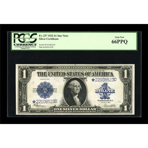 <B>Fr. 237 $1 1923 Silver Certificate Star Note PCGS Gem New 66PPQ.</B></I> Broad margins are noticed on this popular Replacement. The current value in the new Murray book is $1200 in CU. Expect to see that figure as more of a starting point for this lovely note.<BR><BR><b>Shipping:</b> Coins & Currency (<a target="_blank" href="http://www.heritageauctions.com/common/shipping.php">view shipping information</a>)