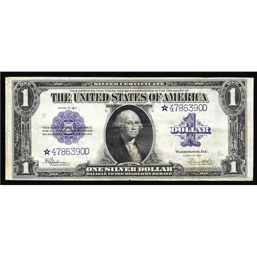 <B>Fr. 237* $1 1923 Silver Certificate Star Very Fine.</B></I> The face and back plate numbers for this seven-digit $1 Silver Star slipped through the Murray dragnet. A trace of embossing remains for the left-hand serial number, while a back quarter panel shows light soiling. All Large Size collections deserve at least one nice Star for type.