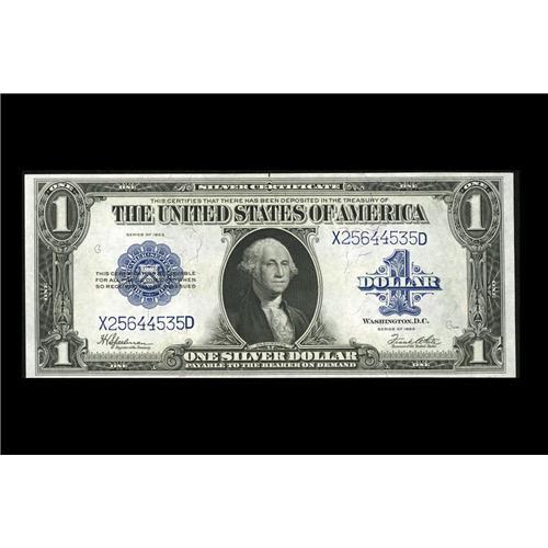 <B>Fr. 237 $1 1923 Silver Certificate Very Choice New.</B></I> The back of this note is slightly shifted downwards at bottom right, otherwise the surfaces are pack-fresh with plenty of embossing present.