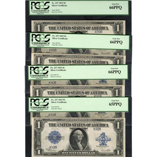 <B>Fr. 237 $1 1923 Silver Certificates Cut Sheet of Four PCGS Gem New 66PPQ (3) & Gem New 65PPQ</B></I>. This lovely quartet carries serial number 89, 90, 91, and 92. These two digit notes are very original with monstrous embossing detected along with bright inks. <BR><BR><b>Shipping:</b> Coins & Currency (<a target="_blank" href="http://www.heritageauctions.com/common/shipping.php">view shipping information</a>)