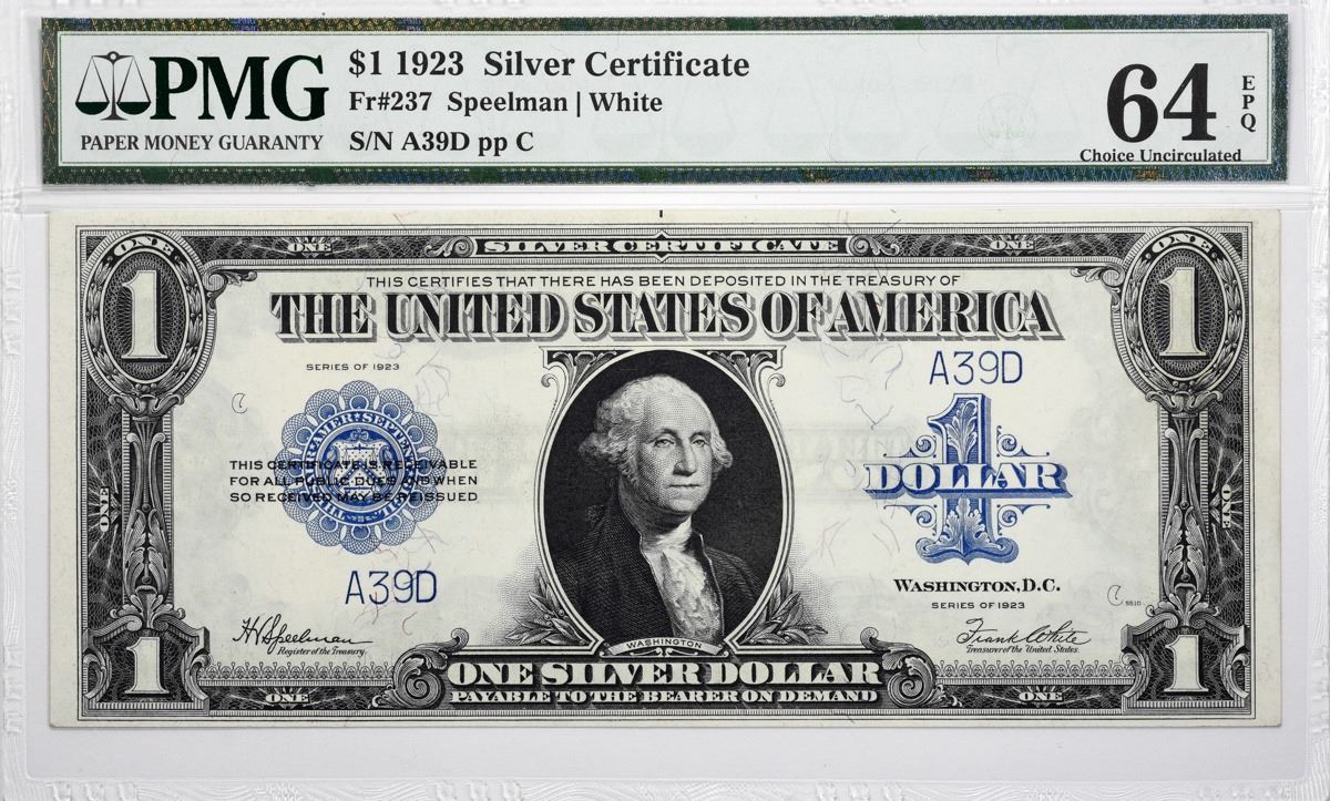 Fr. 237. 1923 $1 Silver Certificate. PMG Choice Uncirculated 64 EPQ. Low Serial Number. Low numbered notes on this 1923 series are far less frequented than the "Black Eagle," notes from 1899. This A39D numbered piece shows pack fresh quality that borders on a Gem state.
