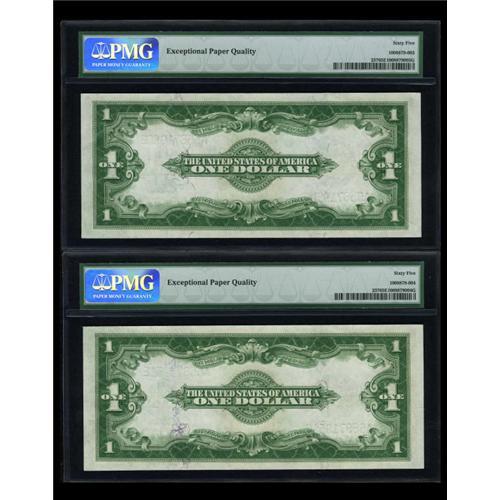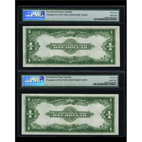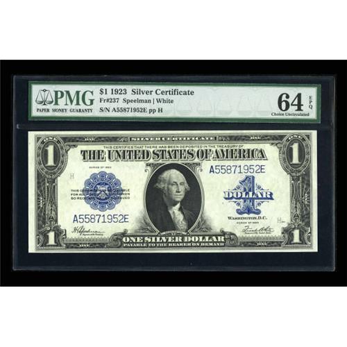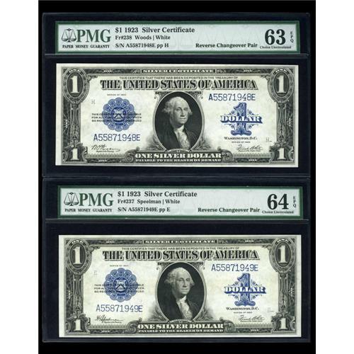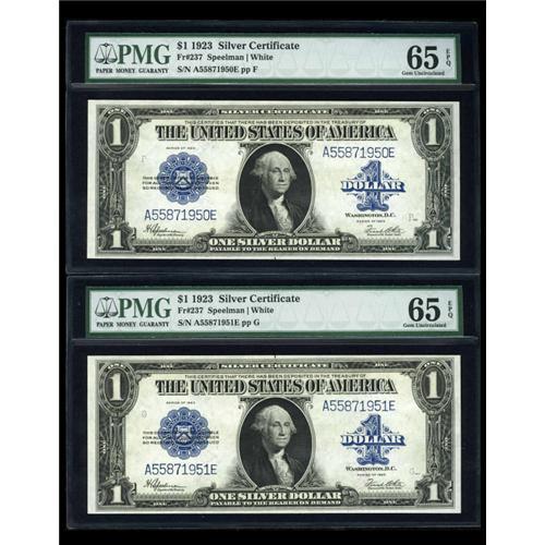 <B>Fr. 237/238 $1 1923 Silver Certificates Five Consecutive PMG Graded.</B></I> The first note of this consecutive group is a Fr. 238, and the next four are Fr. 237's. The initial pair of this run is often called a "changeback" or "reverse changeover" pair, as the higher Friedberg number is the lower serial number. While Fr. 238/237 changebacks are relatively common, they are extremely popular and this nice group should get quite a bit of attention. The notes are all PMG graded and grade respectively <B>63 EPQ</B></I>, <B>64 EPQ</B></I>, <B>65 EPQ</B></I>, 6<B>5 EPQ, and 64 EPQ</B></I>.<BR><BR><b>Shipping:</b> Coins & Currency (<a target="_blank" href="http://www.heritageauctions.com/common/shipping.php">view shipping information</a>)