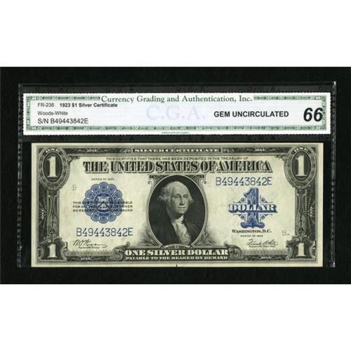 <B>Fr. 238 $1 1923 Silver Certificate CGA Gem Uncirculated 66.</B></I> Deep embossing of the serial numbers is noted on this fully margined Gem.<BR><BR><b>Shipping:</b> Coins & Currency (<a target="_blank" href="http://www.heritageauctions.com/common/shipping.php">view shipping information</a>)